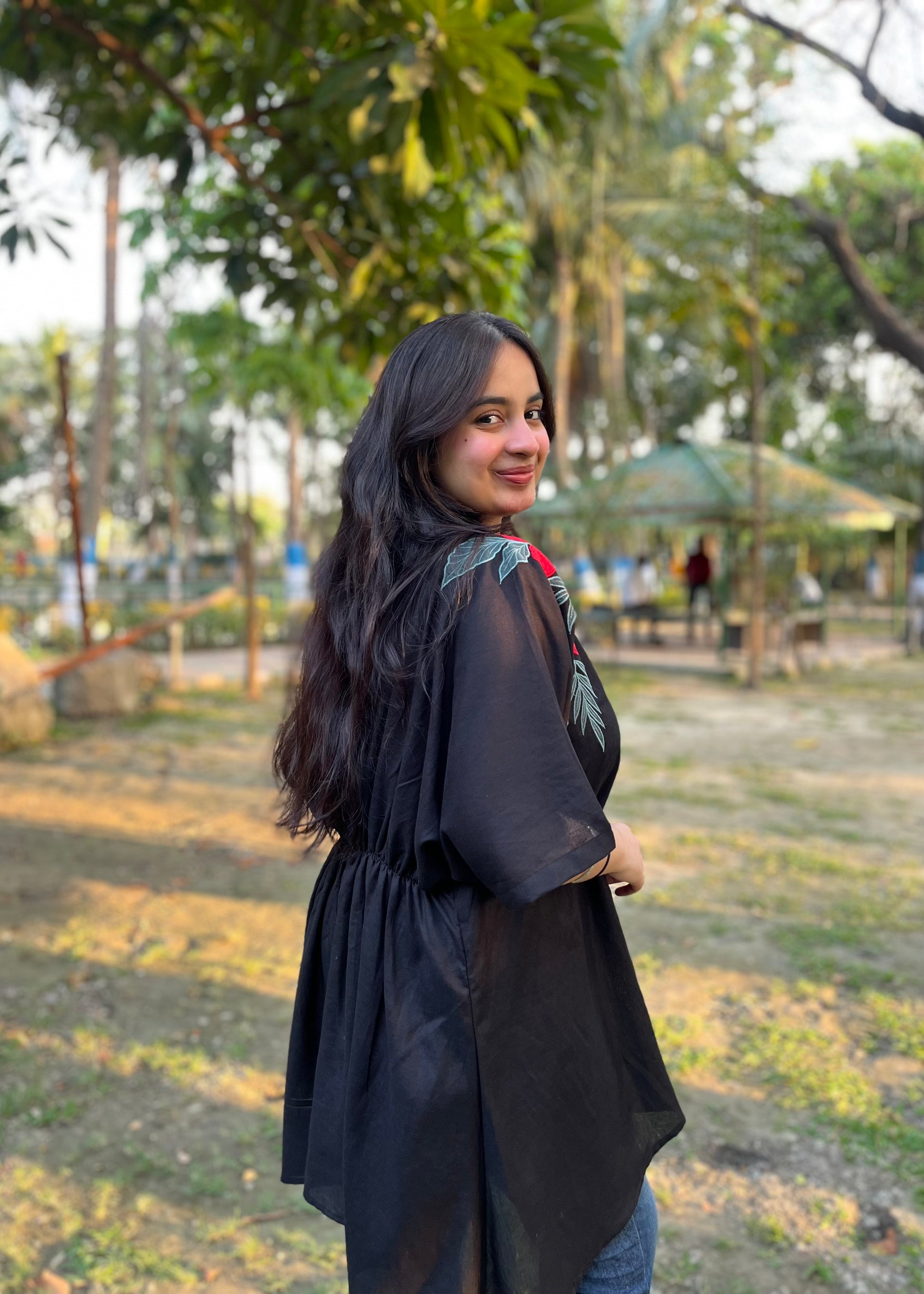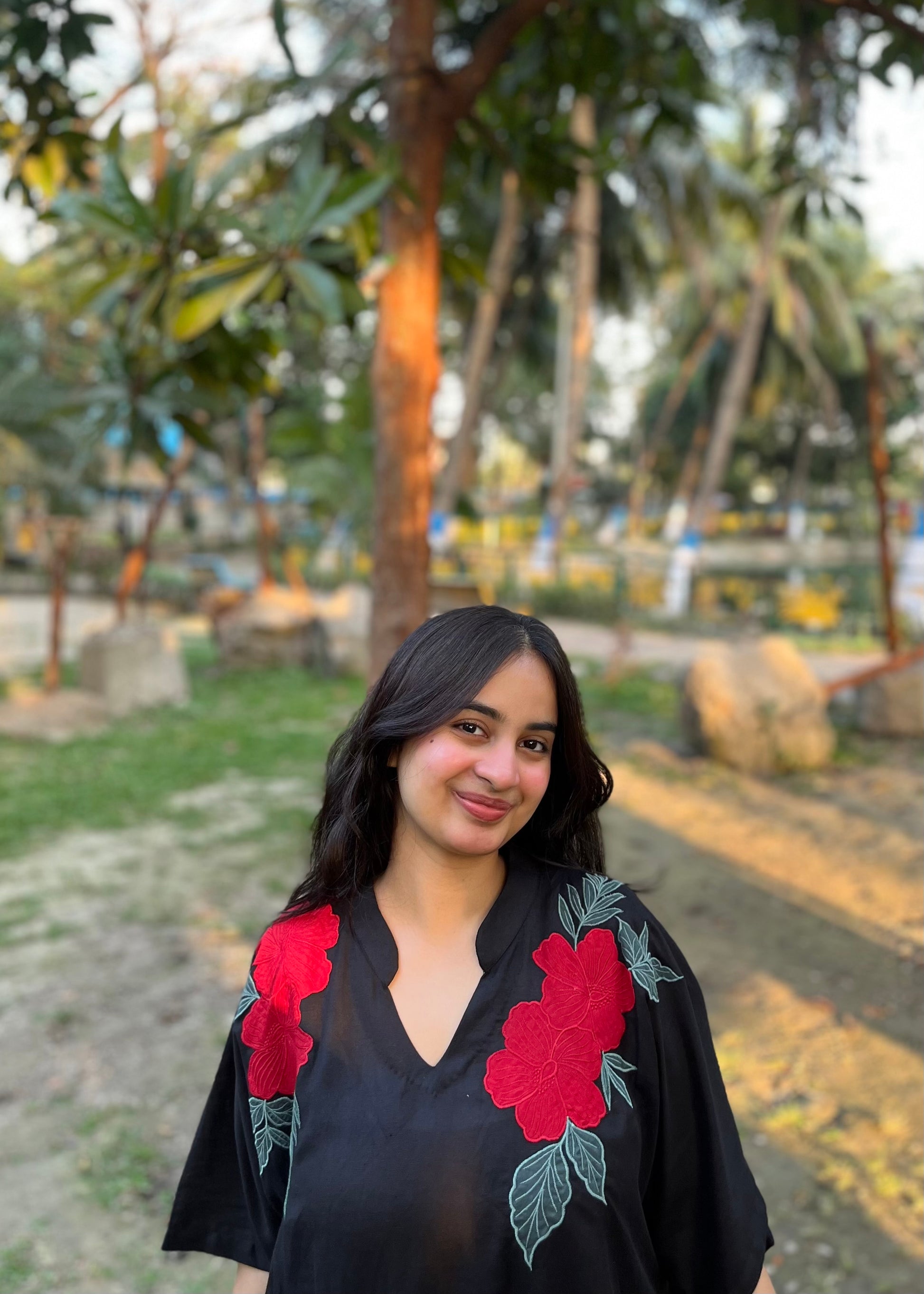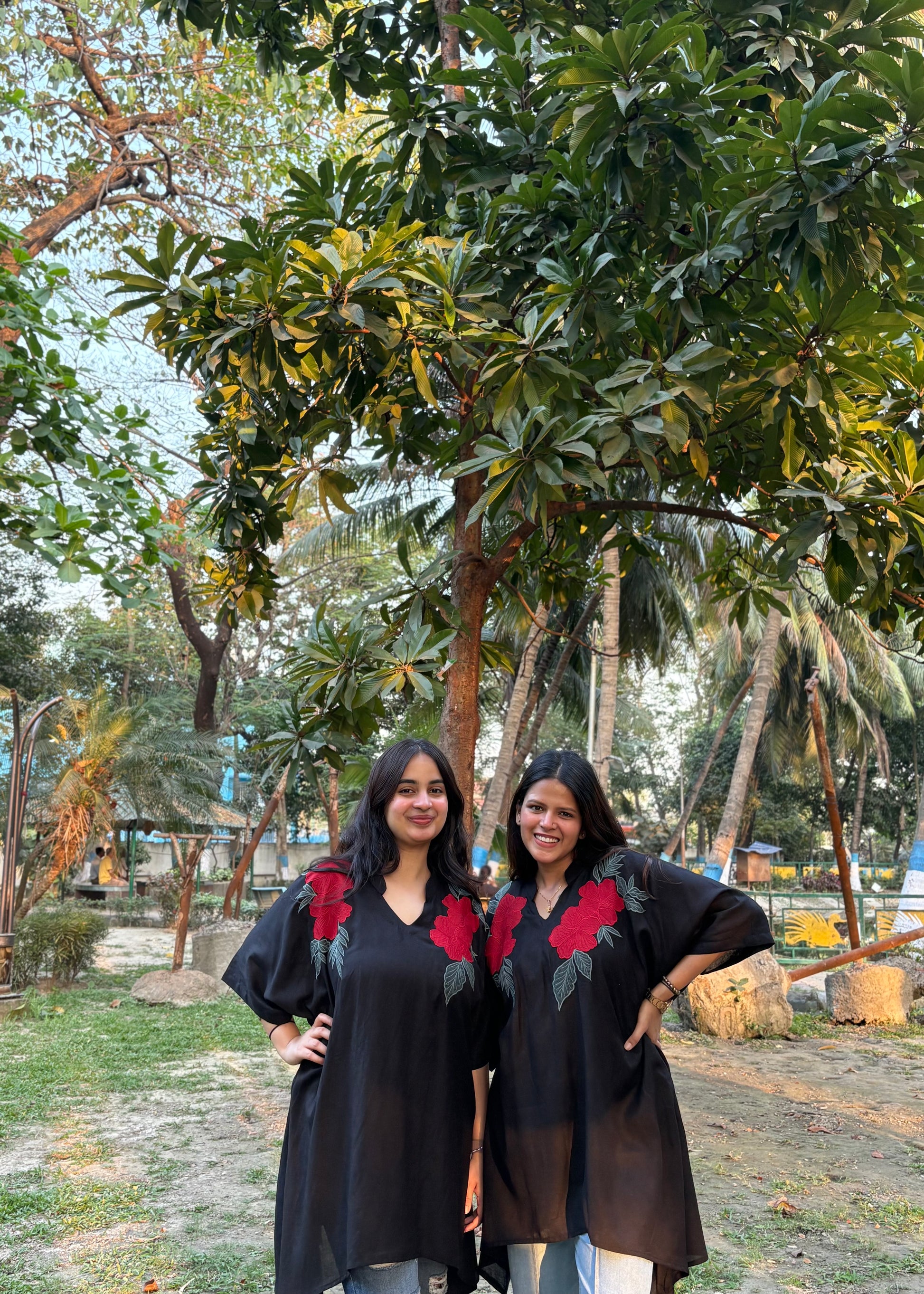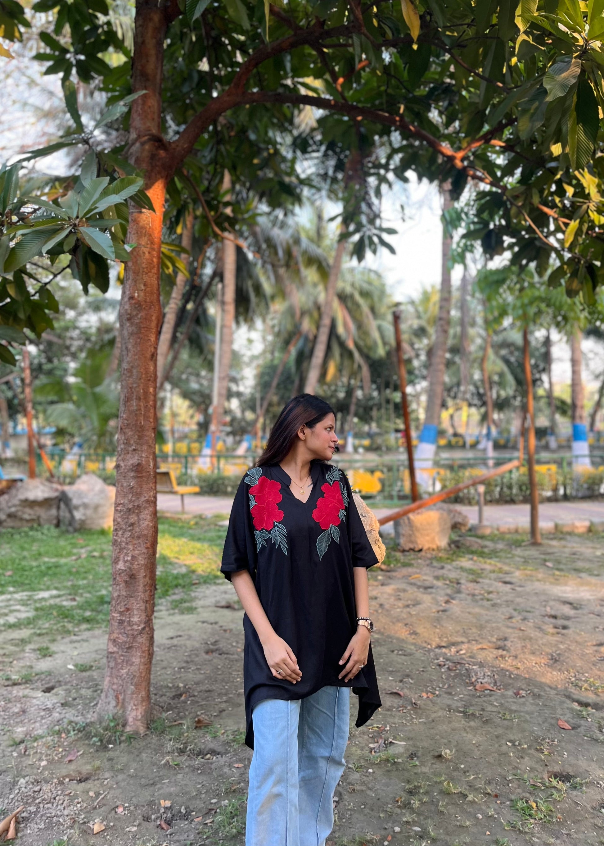 Hibiscus Kaftan Top is applique embroidered on linen with a beautiful red on black combination