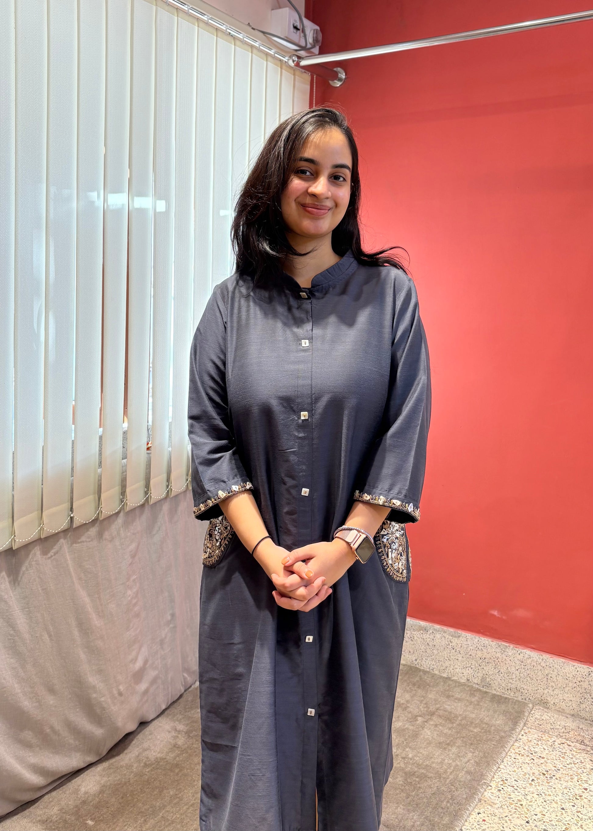 • Intricately hand-embroidered with real shells and beads in a silver-golden combination