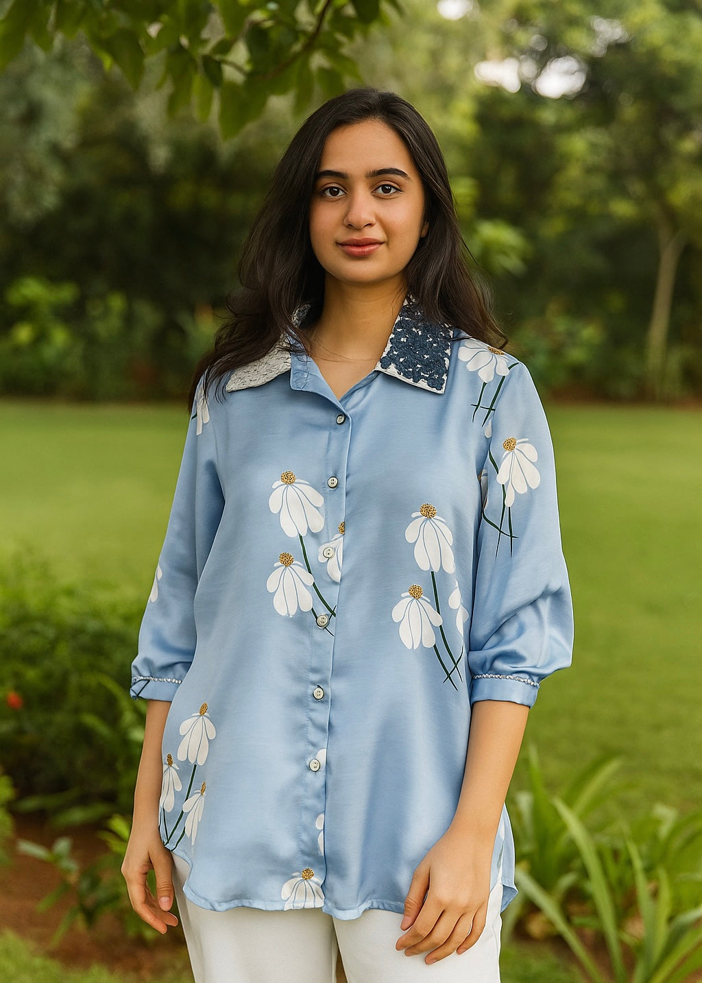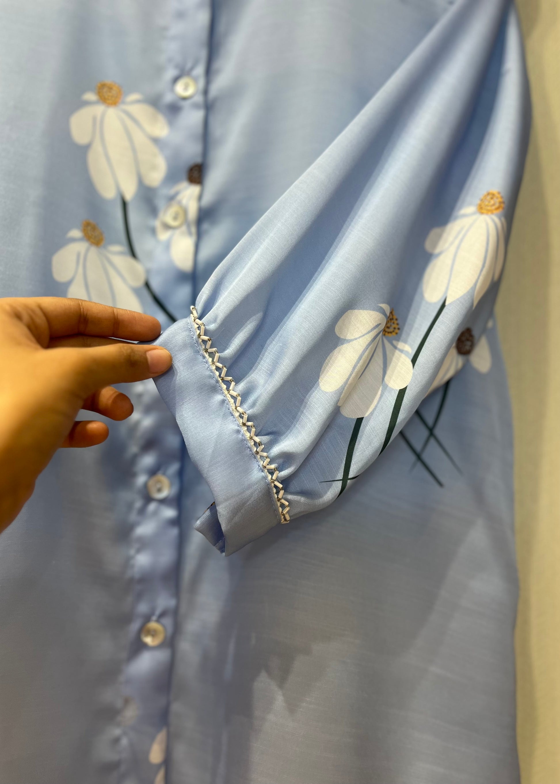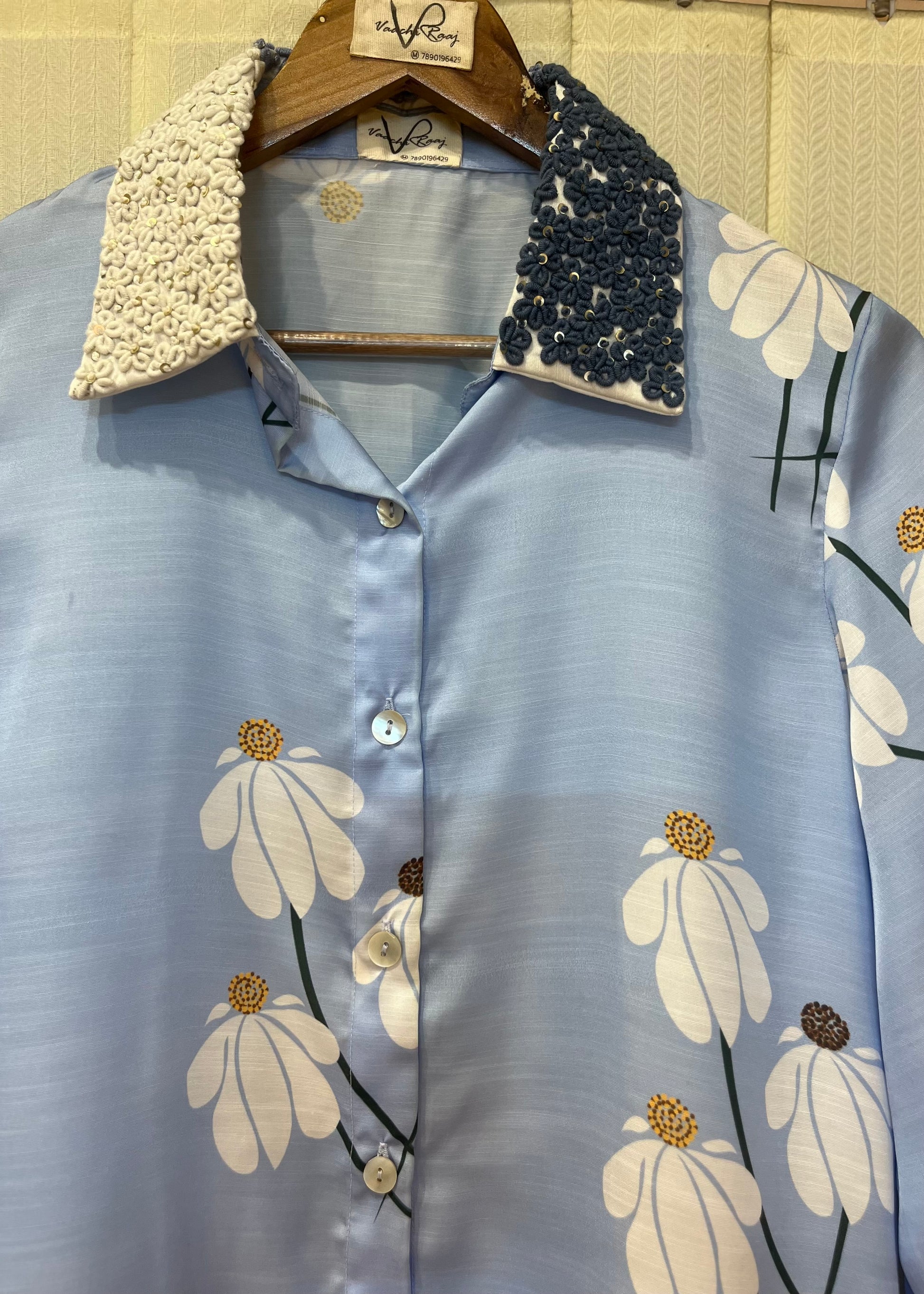 • Hand-painted daisy artwork with knot embroidery on the collar